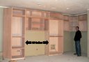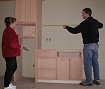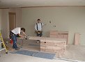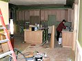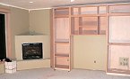 Thursday, December 22, 2005 Most of the cabinets for the downstairs entertainment center were set today. Matt and Stan still have work to do over the fireplace and in the ![]() opposite corner where a computer desk will be placed. We had our doubts about the opening where the TV will go being large enough, but after measuring it's more than high and wide enough. The depth is another issue. It may be a few inches too skinny so that the![]() TV will project out from the cabinets a minimum of three inches and we're not sure if this should bother us. There may be a way for Matt to trim around the TV or it might be better to just live with it. We'll find out Friday. He also got the bar cabinet and downstairs bathroom uppers installed. Manuel and crew continued the massive task of taping and papering everything off on the main level in preparation for shooting stain.
