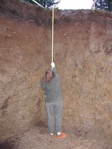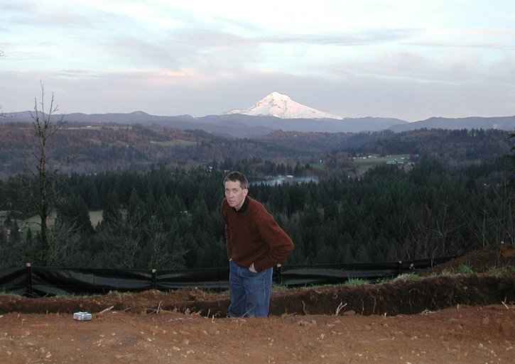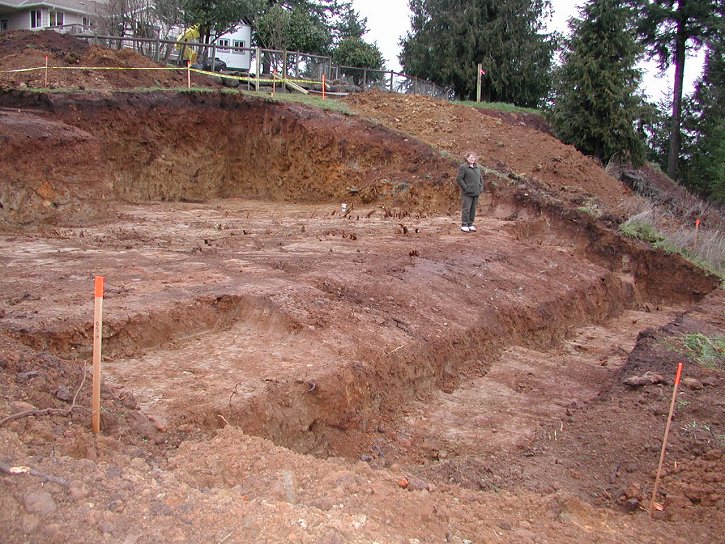 Wednesday, January 26, 2005 So begins the official online record keeping of our hillside adventure. Joy picks up permits from the City of Sandy today. That's about as official as it gets. Now what? Thursday, January 27, 2005 Shawn and Dave started the excavation today. ![]() The dig-out looks impressive with an 11-foot high wall of dirt carved out for the west side of the downstairs utility room. It looks like an archaelogical site dig with the different stratas exposed. The two small trees on the site were picked up and thrown into the neighbor's yard where our friends, Ed and Laurie, will cut them up for firewood.
