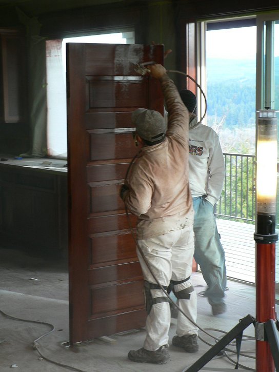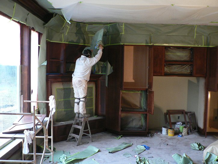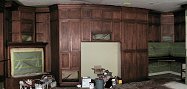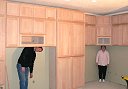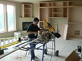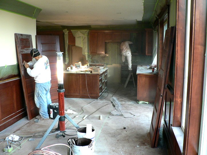 Wednesday, January 18, 2006 Manuel and crew are putting the finishing touches on the shiny part of their process today and tomorrow. ![]() ![]() When I arrived this afternoon he had just put a fresh coat of lacquer on my downstairs cabinets. This was especially evident on the corner desk which looked like a pool of water. The next phase will be starting upstairs again and working down to the basement with the "real" coat of paint. What Gary sprayed back at the end of June was a preliminary coat, almost a primer. This should all be done by next Thursday.