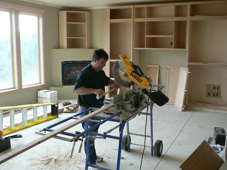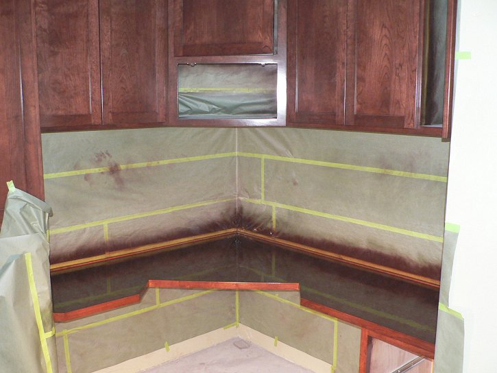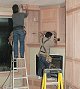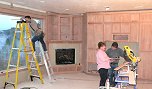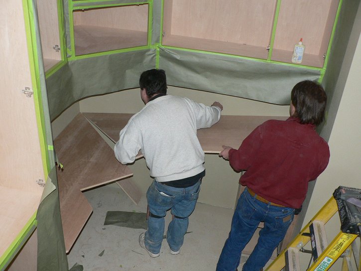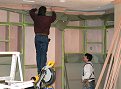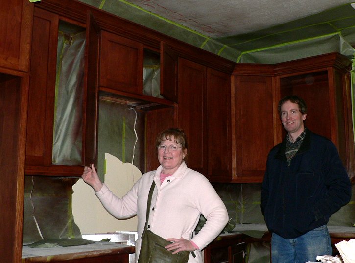 Monday, January 9, 2006 ![]() ![]() I got a rare chance in the morning hours to snap some pictures of the cabinetry and woodwork on the main level with all the masking paper removed. Manuel was downstairs masking off Matt's cabinets to spray the interiors and was just getting ready for lunch when Matt and ![]() Stan showed to finish the last details of crown molding and placing of the computer desk. But that meant that Matt had to peel back Manuel's papering to get access to where he left off on Sunday. Manuel has literally been following on Matt's heels for weeks now and Joy and I are getting a kick out of it.