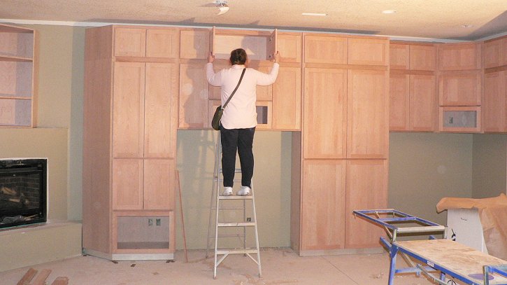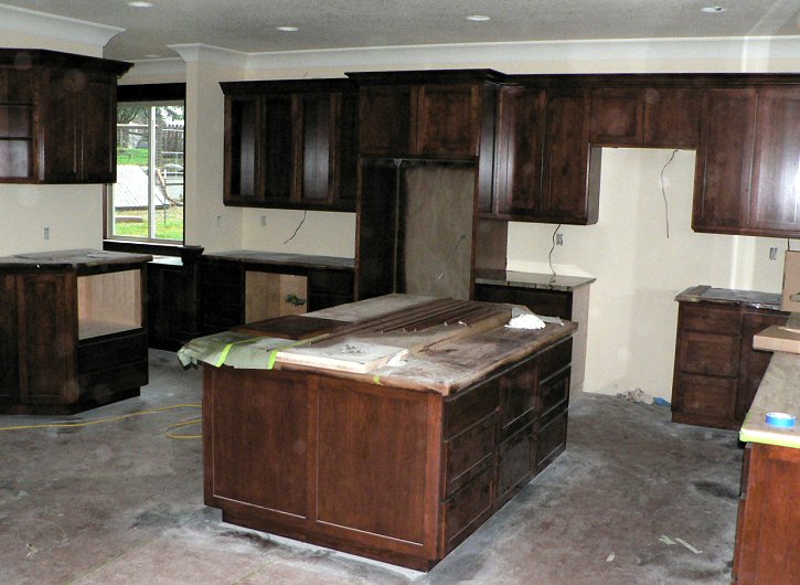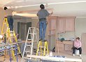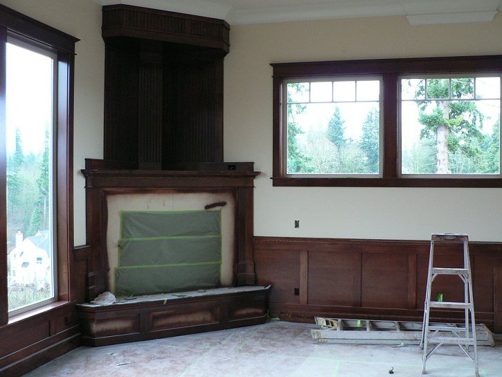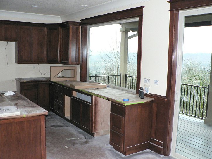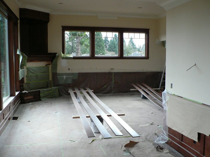 Saturday, January 7, 2006 Manuel and crew removed all the paper from the main ![]() level, revealing the windows and walls in contrast to the beautifully stained wood cabinets and trim. He took a couple days off to rest his sanding arm while Matt and Stan continued piecing together the basement level cabinets. They were also charged with hanging the bonus room's ![]() crown molding and tying that into the cabinets. Joy hung around and supervised for most of the day. I came by later in the afternoon and cleared the garage of Manuel's masking paper, assorted lunch scraps and empty stain cans. Matt's New Year's resolution to cut back on the work week gets broken with a Sunday showing tomorrow.