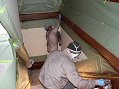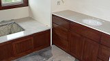 Monday, January 23, 2006 ![]() Our tile man, Tom and crew snuck in on Sunday and set slab marble on the master vanities and spa tub deck, along with the laundry counters. This had actually been planned for some time but we were never sure when he was going to get the time. We went with a creamy, Botticino color which has light veins and contrasts nicely with the dark wood. Instead of a marble edge, we'll have a wood trim installed on the cabinets just below each edge to give the edges support and cover some of the exposed plywood support board. Manuel started his partial week of painting by cutting in those areas where he won't be using a roller.