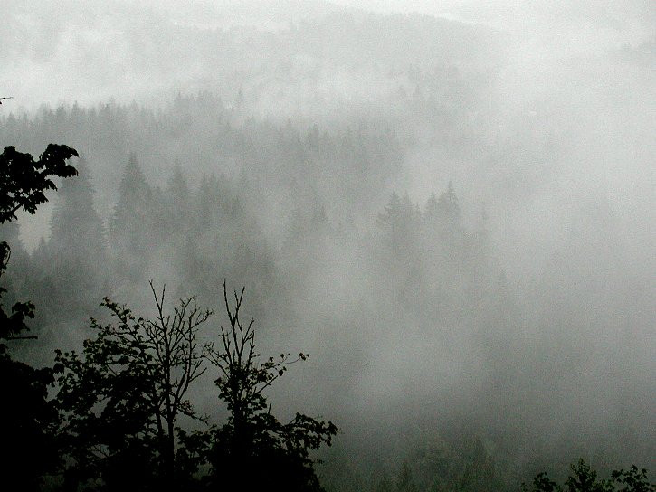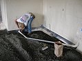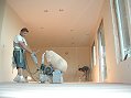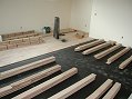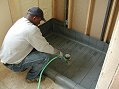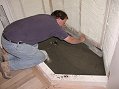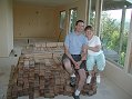 Saturday, July 9, 2005 ![]() ![]() ![]() After two very long days, Marcel's guys finished the entire hardwood installation Friday evening. A sanding and first coat of finish is to follow at some point next week, so we didn't bother to clean up the stray sawdust. Having all the hardwood and interior painting done further helps Joy in determining area rugs, tile and window coverings. An eerie mist wafted up from the trees filtering though from the river beyond the bluff. It rose to meet us but flowed away with the rain after a few minutes. Saturday I cleaned up wood scraps and set aside good excess for repairs down the road. I'll stick it up above the garage once the insulators are done. Our tile installers,![]() ![]() Tom and Robin, made a first visit to set pan liner in the three shower areas, sloping sand and cement and placing pan liner for a proper slope to the drains. Each pan was filled with water for the plumbing inspector to check for leaks.