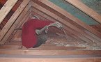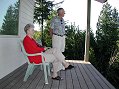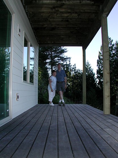 Wednesday, July 27, 2005 Today is our 14th wedding anniversary. Marcel showed in the evening to do a first fill and sanding of the hardwood. James wrapped deck posts and ![]() finished cedar application on the upper deck ceiling. Joy has settled into a routine with the morning radiation treatments. We got word yesterday that she may have to undergo an endoscopic ultrasound when it comes time to explore around the pancreas. When I did a little research we were both a little horrified at the idea of it, but maybe it's not so bad if you're unconscious.