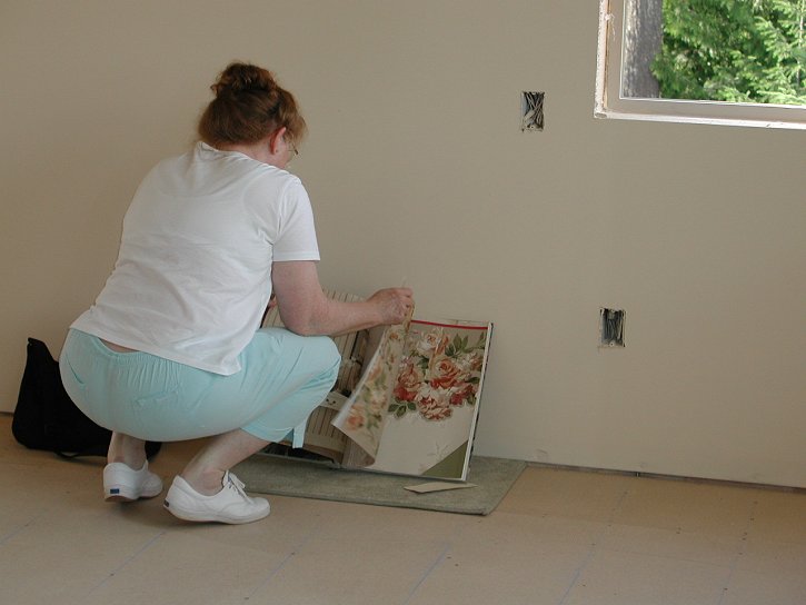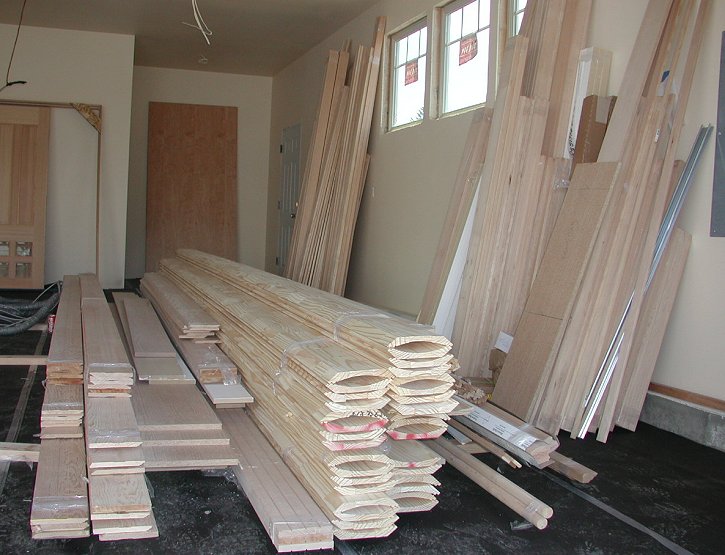 Joy is in love with her color choices. It's nice to have her confident that she made the right decisions because there was a lot of doubt along the way. The wallpaper, carpet and tile samples have now cozied up to just about every wall in the house. The colors seem to offer a lot of flexibility for determining these other choices. Rick had the particle-board laid upstairs in a couple hours where we intend to put carpet. The half-inch thick board will give the surface smoothness, insulation and better transition height to the master bathroom, vanity and laundry floor tile areas. 1600 square feet of quarter-sawn red oak was delivered and stacked in the living room to start acclimating for a couple weeks. The entire main level will receive the wood. If you've been reading this from time to time you know that Joy got through her breast cancer lumpectomy without any problems and that there was no sign of any more cancerous tissue. She went to the doctor to get prepped for her 33 daily radiation treatments which will start in a couple weeks, a necessary part of the process to totally eradicate these evil cells. She'll be experiencing some tiredness and fatigue as we get closer to completing the house.