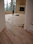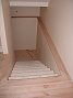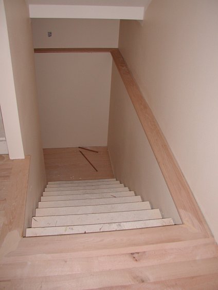 Thursday, July 7, 2005 ![]() ![]() Marcel's guys got close to half of the hardwood installed. After distributing bundles throughout the main level, they loose-fit appropriate sized pieces over vapor paper for a number of widths and then hammer-nailed away. Thanks goes to our friend Dennis, who works for our hardwood source. He spent half the morning locating the stairnose we needed for the stairwell and personally delivered it to us just as the installers were nearing that point of the installation. The four-inch wide quarter-sawn red oak has a conservative rustic quality. Understated contrast to the tight, lineal grain gives way to beautiful imperfections (knots and wormholes?). I'm voting for a very light touch of darker stain to bring out a little more contrast. Dan attached metal flashing up the garage sheetrock to protect it from the concrete he plans to pour Monday.
