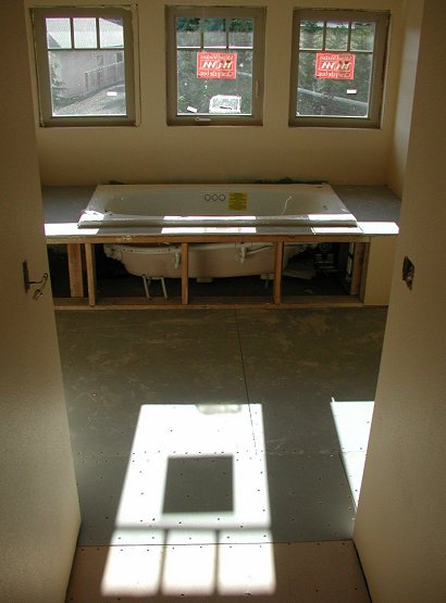 Friday, July 22, 2005 ![]() Leafguard returned and connected downspouts to their gutters. No more splashy puddles! Tom finished the second phase of the shower pan installations by forming the curbs, filling the liners with cement mix and sloping the floors to the drains. ![]() He also installed tile backer-board on all the shower walls and on the floors of the laundry and master bath. We goofed and forgot to get the spa tub out of his way before the backer-board was applied to the tub deck. It's a cleaner, more finished look to have the tile going under the lip of the tub instead of butting to the edge. So we called the other Tom, the plumber, and he'll remove the tub over the weekend. Hopefully it won't be a big deal to put some backer-board slices nearer to the hole adjacent to where he ended his installation around the tub. Well, we debated on whether to share some news with everyone on Joy and the latest cancer details. When she went in a good week or so ago to get prepped for all these radiation treatments, the doctors saw what looked like a spot on her pancreas. So this past Monday before her radiation treatments they had her back in to look more closely. We got word today that something is definitely there. No one can tell us anything about what it might be, but it's very small. Unfortunately, biopsying the thing is no easy task. She'll have to go under again and let them get to it surgically. The circumstances with her just getting started with radiation treatments and the potential toll that will take on her energy levels, along with the winding down of the building of the house over the next few months points toward any medical intervention needing to take place after we're moved in and settled. At the same time there's this perpetual uncertainty hanging over us telling us not to wait too long. Let me just be the first to say in print, if it isn't already obvious, that this royally sucks.