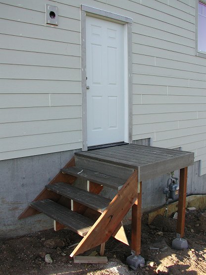 Tuesday, July 26, 2005 ![]() James returned to install Trex on the lower deck and built us a landing and stairs off the south garage exit. Watch that last step until the final grading. It's a doozy. Second phase shower pan inspections passed. Tom pulled the spa tub out of its hole for tile installation. Joy has a Friday appointment with a pancreas specialist to get some bearing on what we should be worrying and not worrying about.