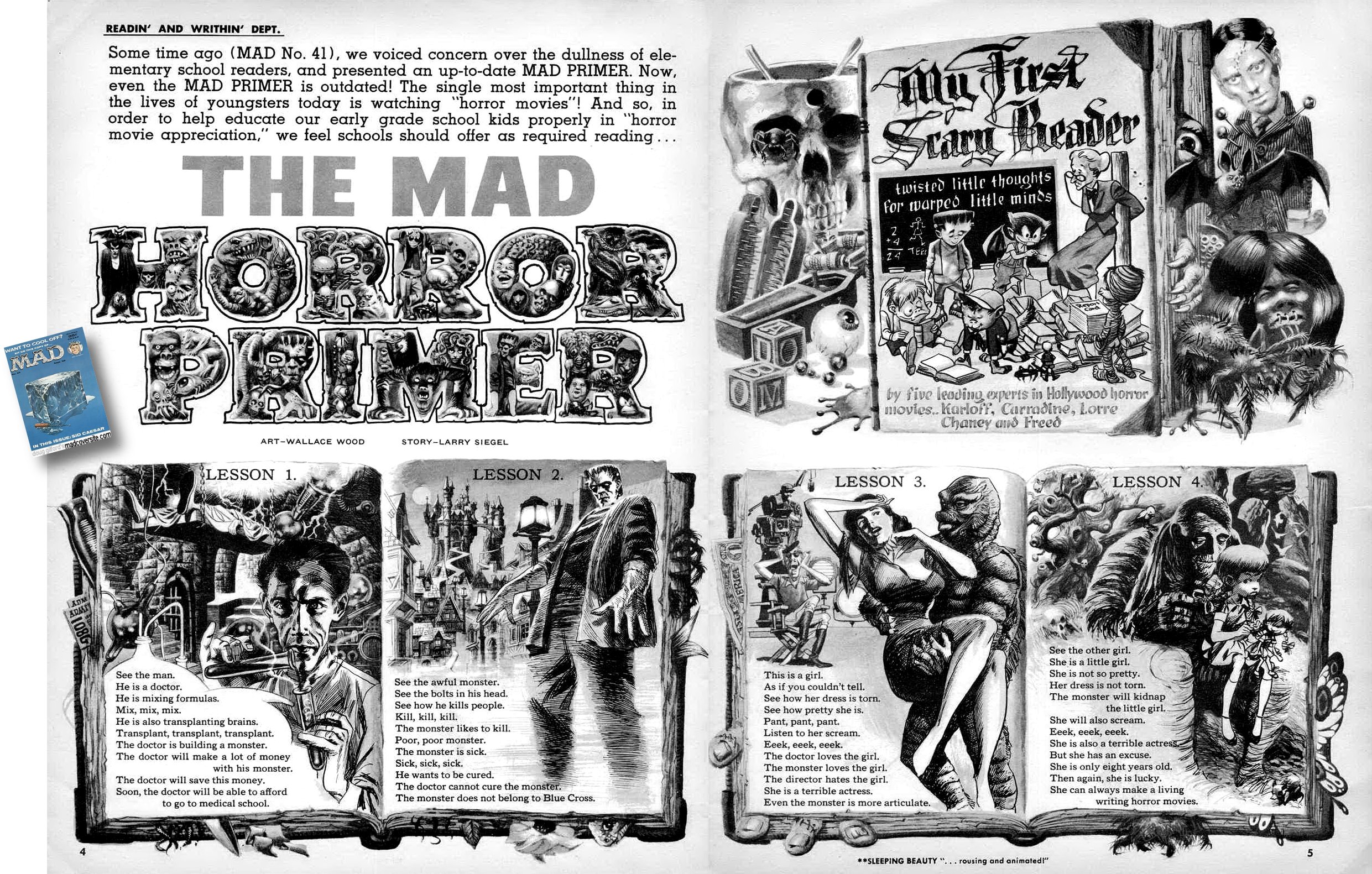 Letters Dept. (ads for Alfred E. Neuman portrait, Alfred E. Neuman sings "What, Me Worry?" and his Furshlugginer Five Play "Potrzebie" on the Hottest 45 Record Out, Mad Forever, The Bedside Mad, Summer is the best time to subscribe to Mad!) (2-3)